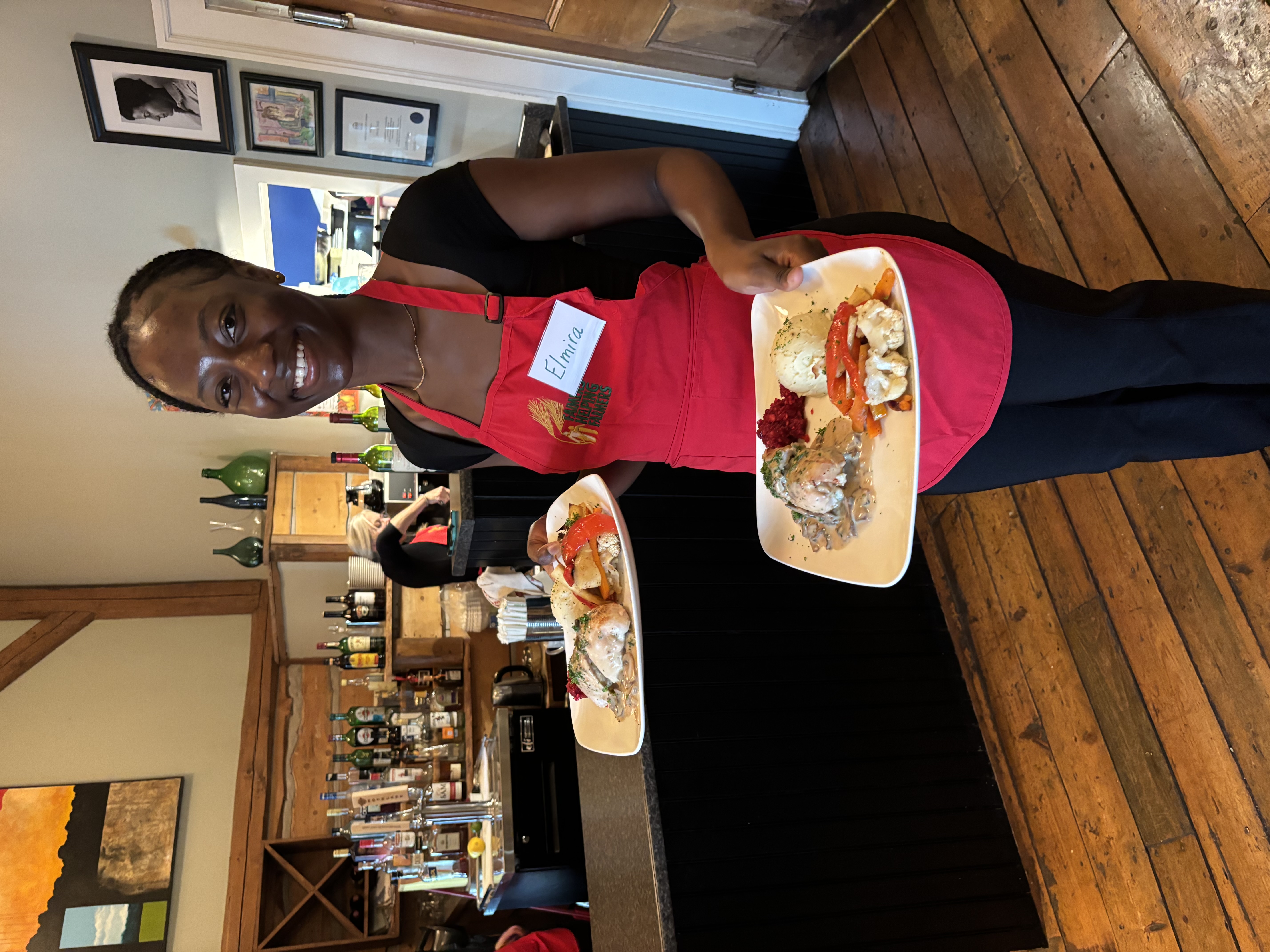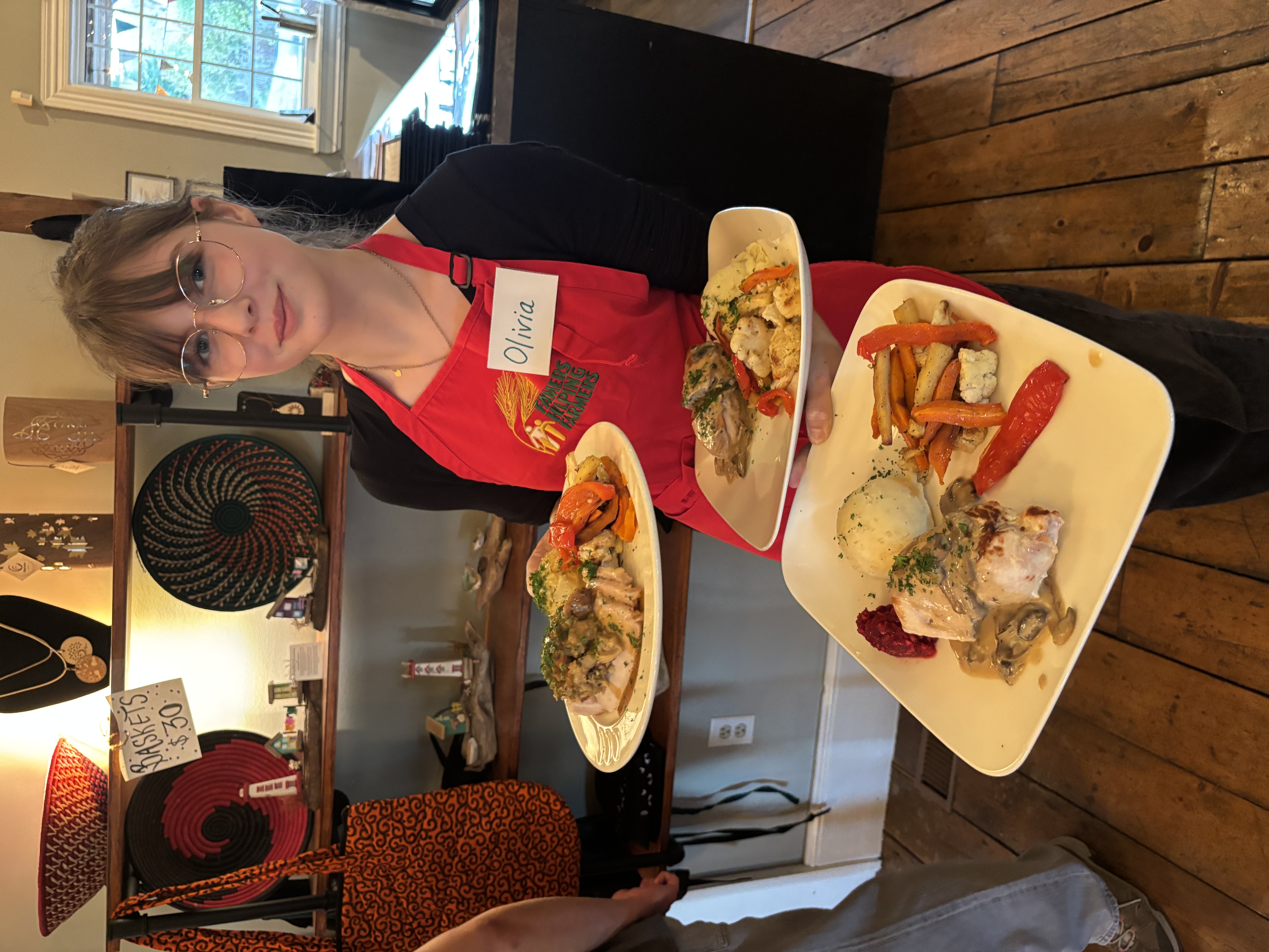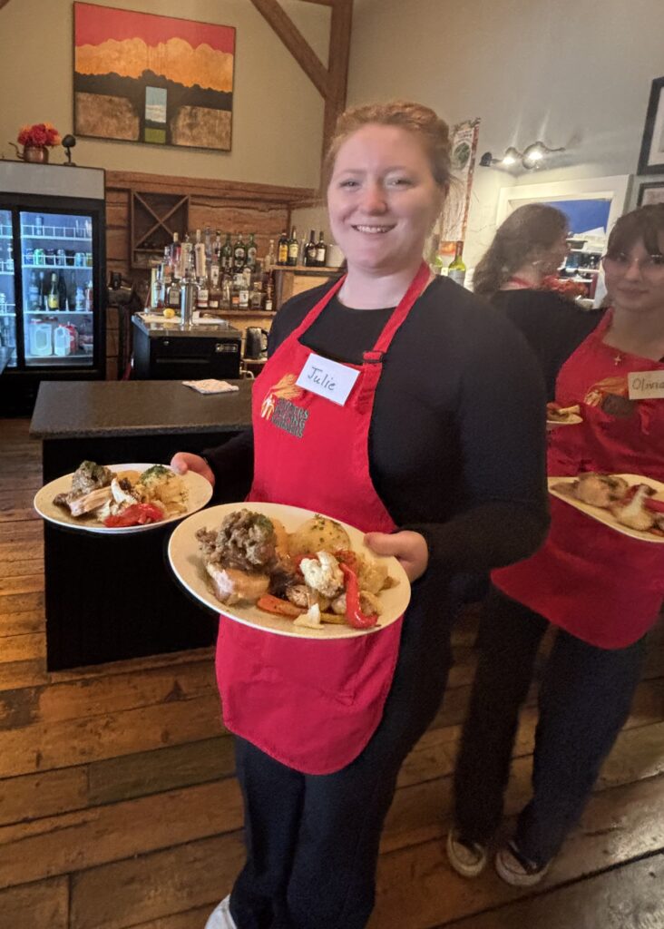 The Fall Harvest Suppers are truly a team effort, as many of Chef Emily’s staff donate their time and tips, and volunteers from Farmers Helping Farmers pitch in, peeling potatoes, chopping up vegetables and washing dishes.